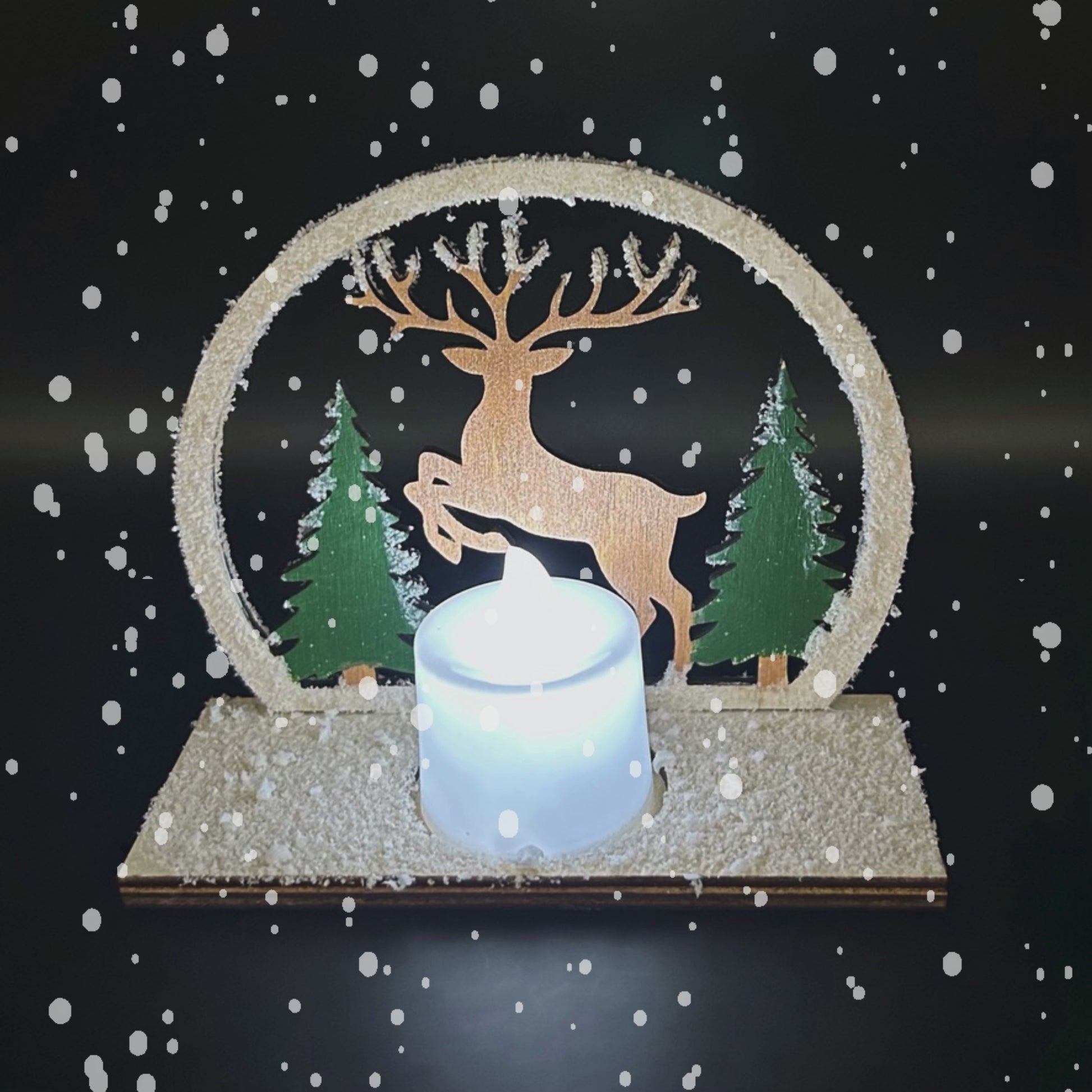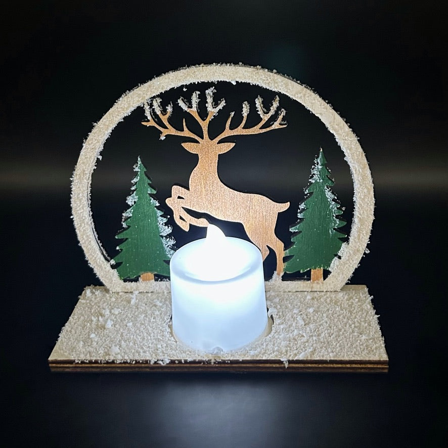 Елегантният силует на елен, заобиколен от зимни елхи, грее красиво, когато свещичката светне. Светлината пада меко върху сцената и създава усещане за топлина, уют и празничност — дори в най-обикновената вечер.