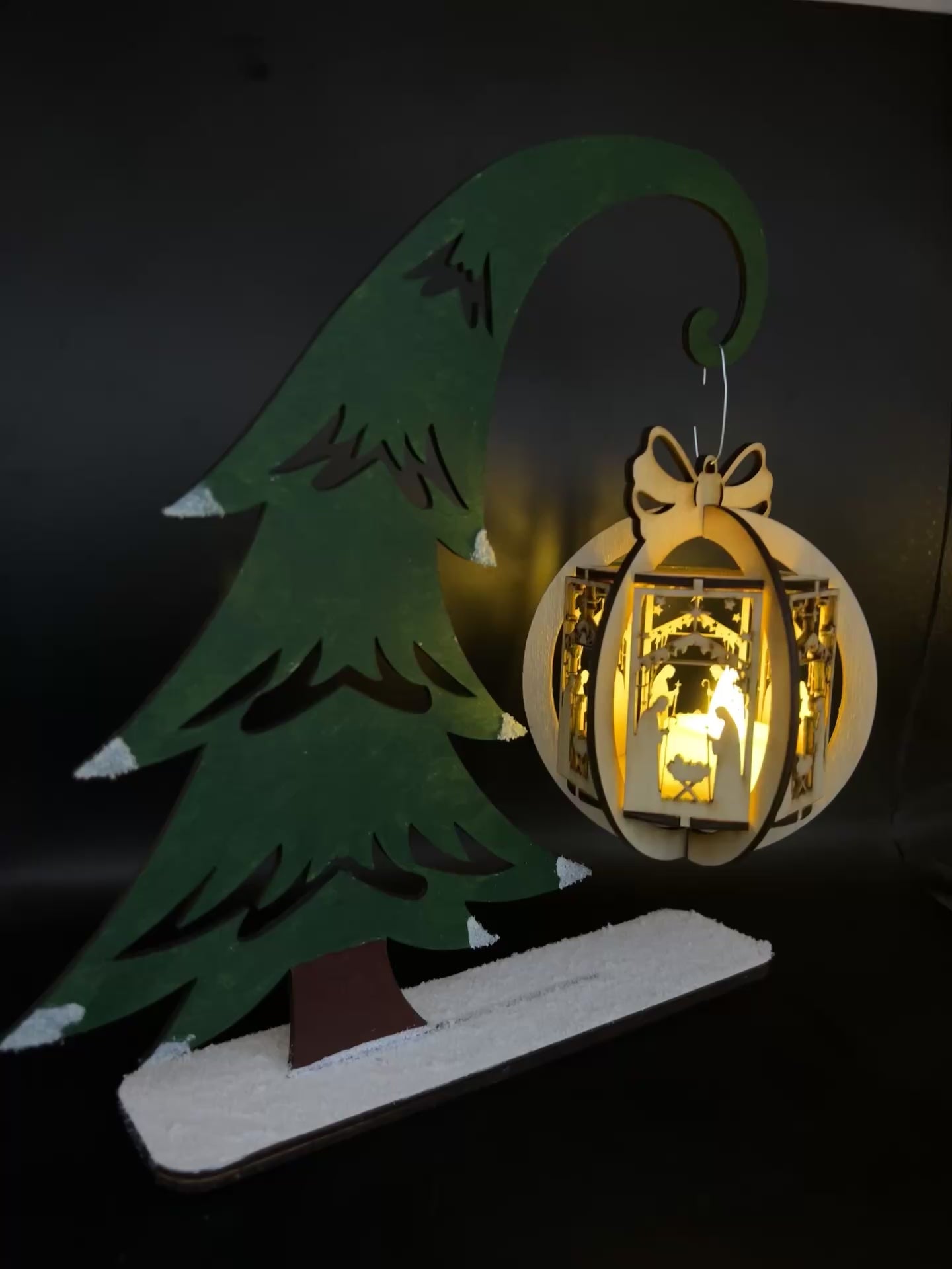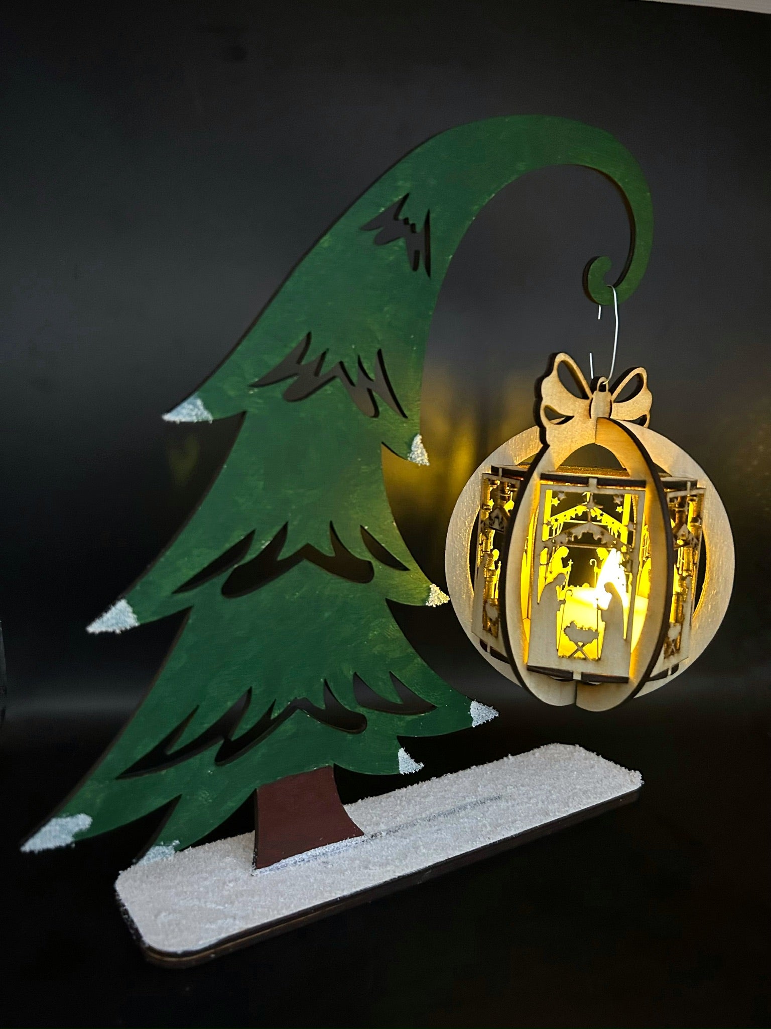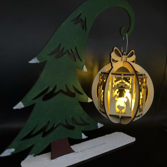 Добави истинска коледна магия към дома си с тази ръчно изработена дървена декорация. Елегантната извита елха държи нежно висяща дървена топка, в която свети малка LED свещ. Топлината на светлината осветява фините лазерни детайли и създава уютно коледно настроение във всяка стая.