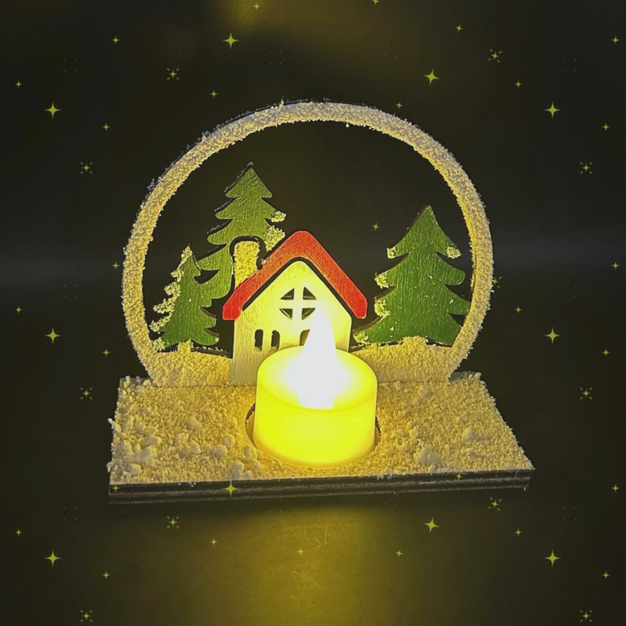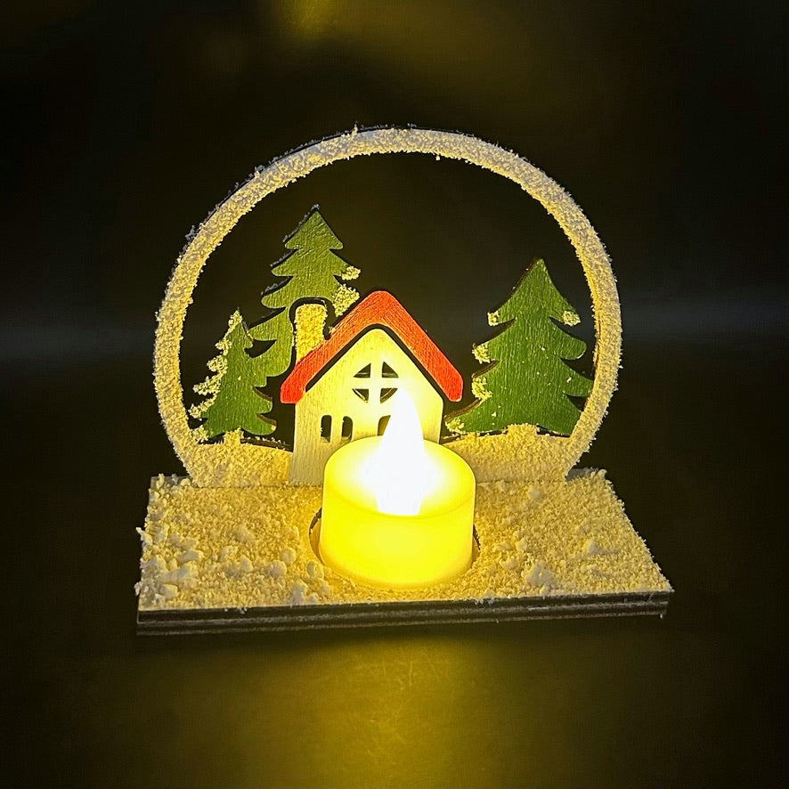 Когато запалите свещичката, къщичката оживява: прозорците започват да блестят, елхите се очертават в меко сияние и сякаш усещате топлината на домашния уют.