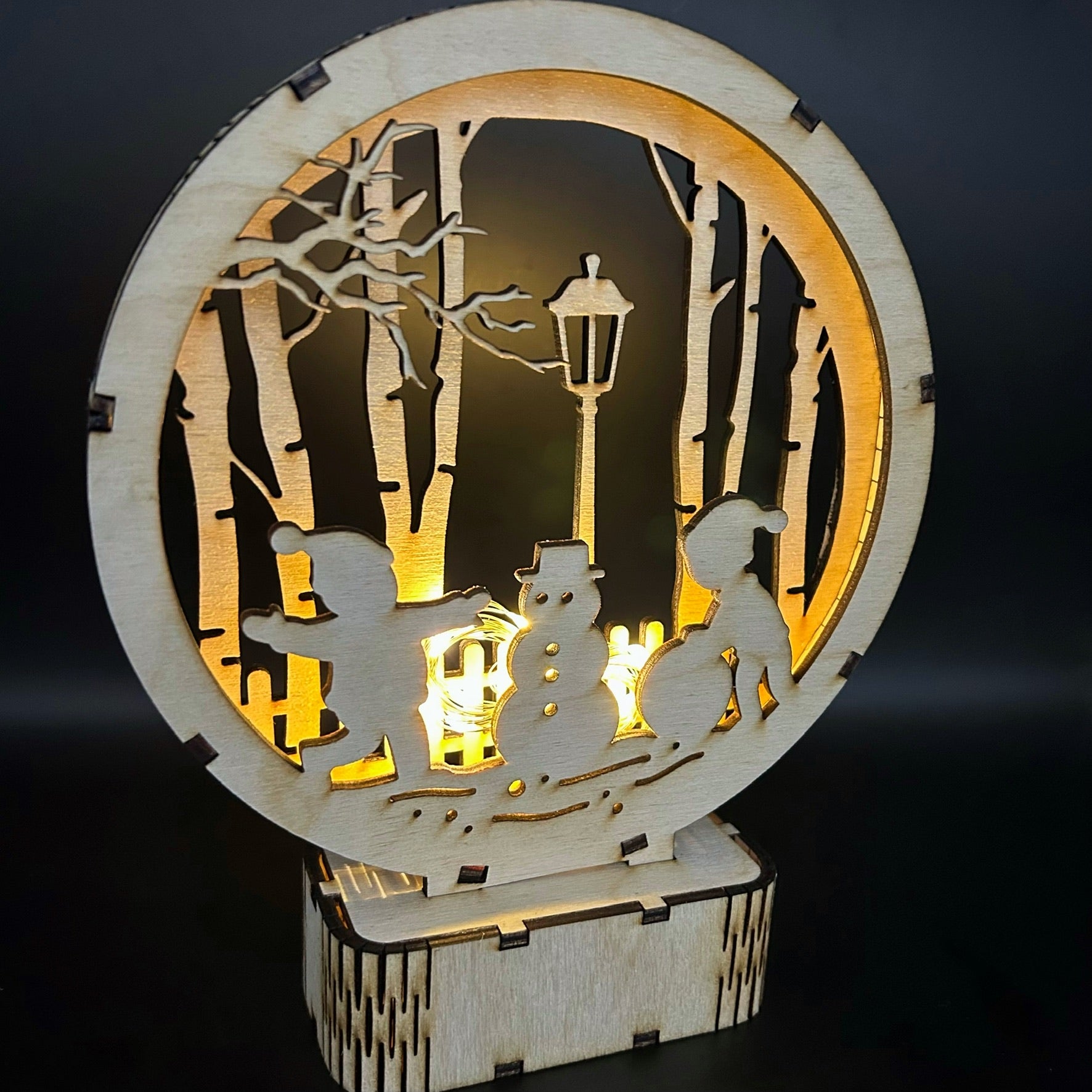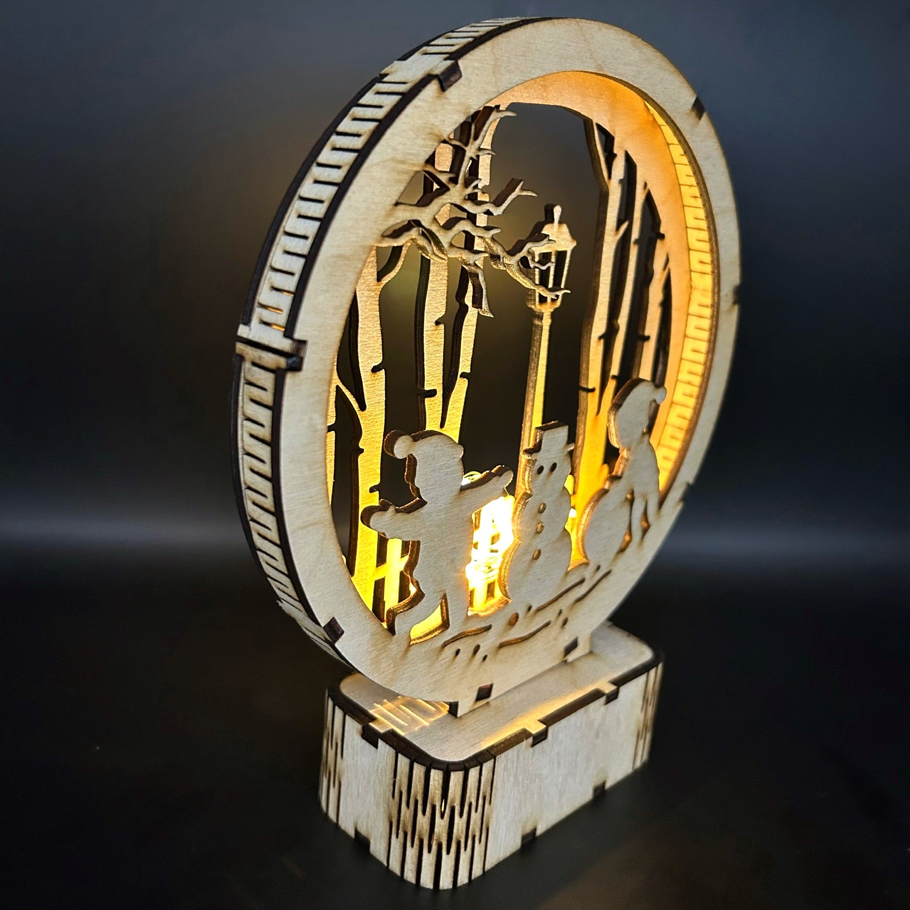 Внеси магията на зимната приказка у дома с тази ръчно изработена дървена светеща декорация от Работливко. В кръглата рамка оживява уютна зимна сцена – две деца, снежен човек и класическа улична лампа, заобиколени от високи зимни дървета.