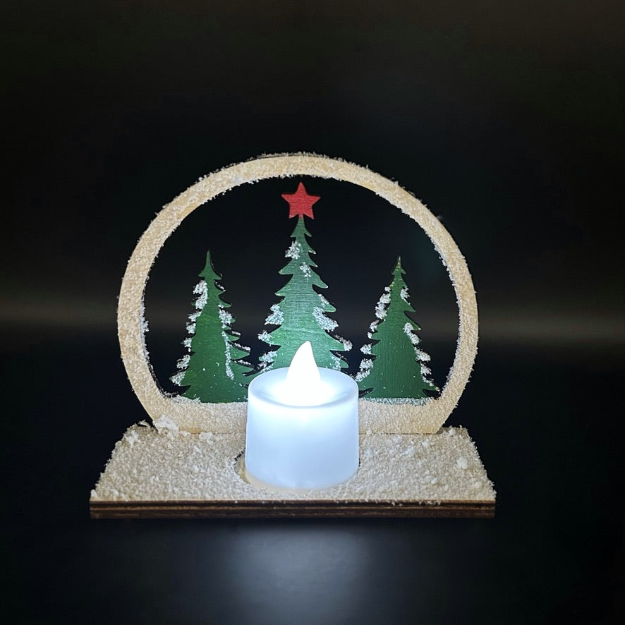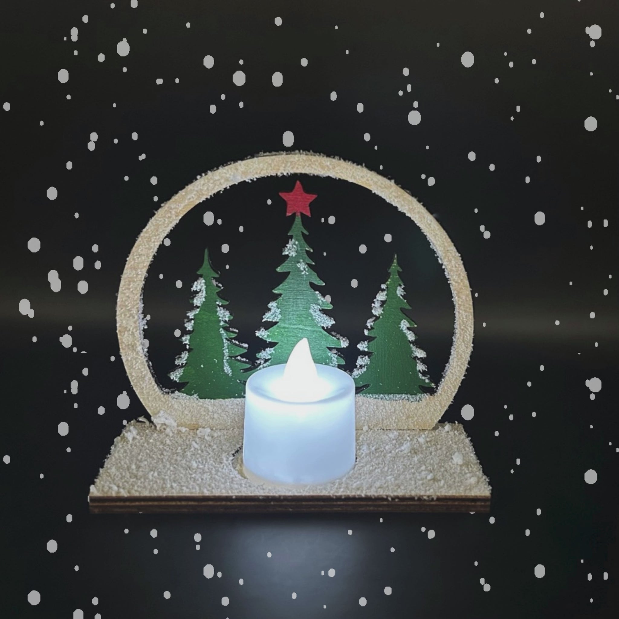 Когато свещичката светне, пейзажът оживява — снегът блести, елхите изпъкват, а звездата сякаш води светлината напред. Това е мини сцена, която носи уют, празничност и едно тихо, истинско коледно усещане.